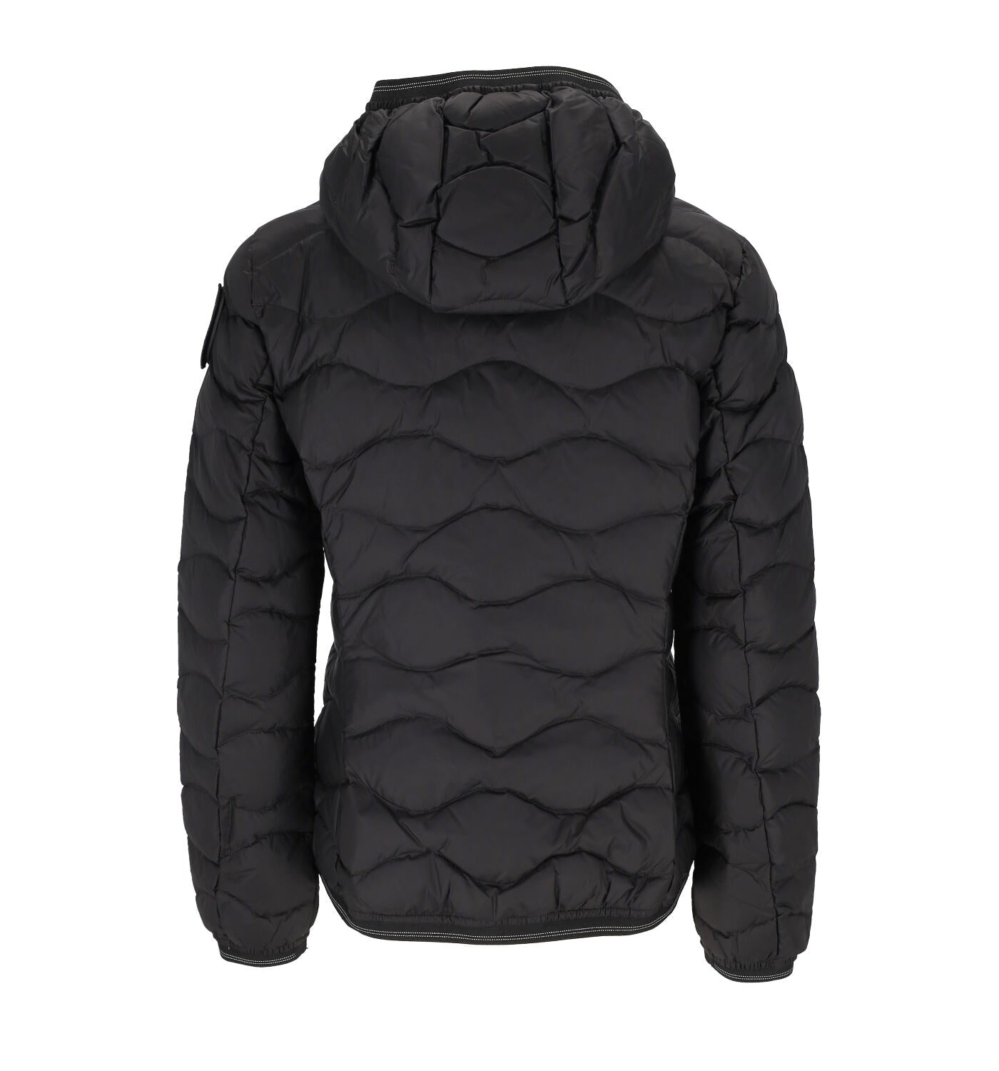 Giubbino corto con cappuccio trapuntato ondina, stemma con strass removibile, imbottitura in piuma d'oca.