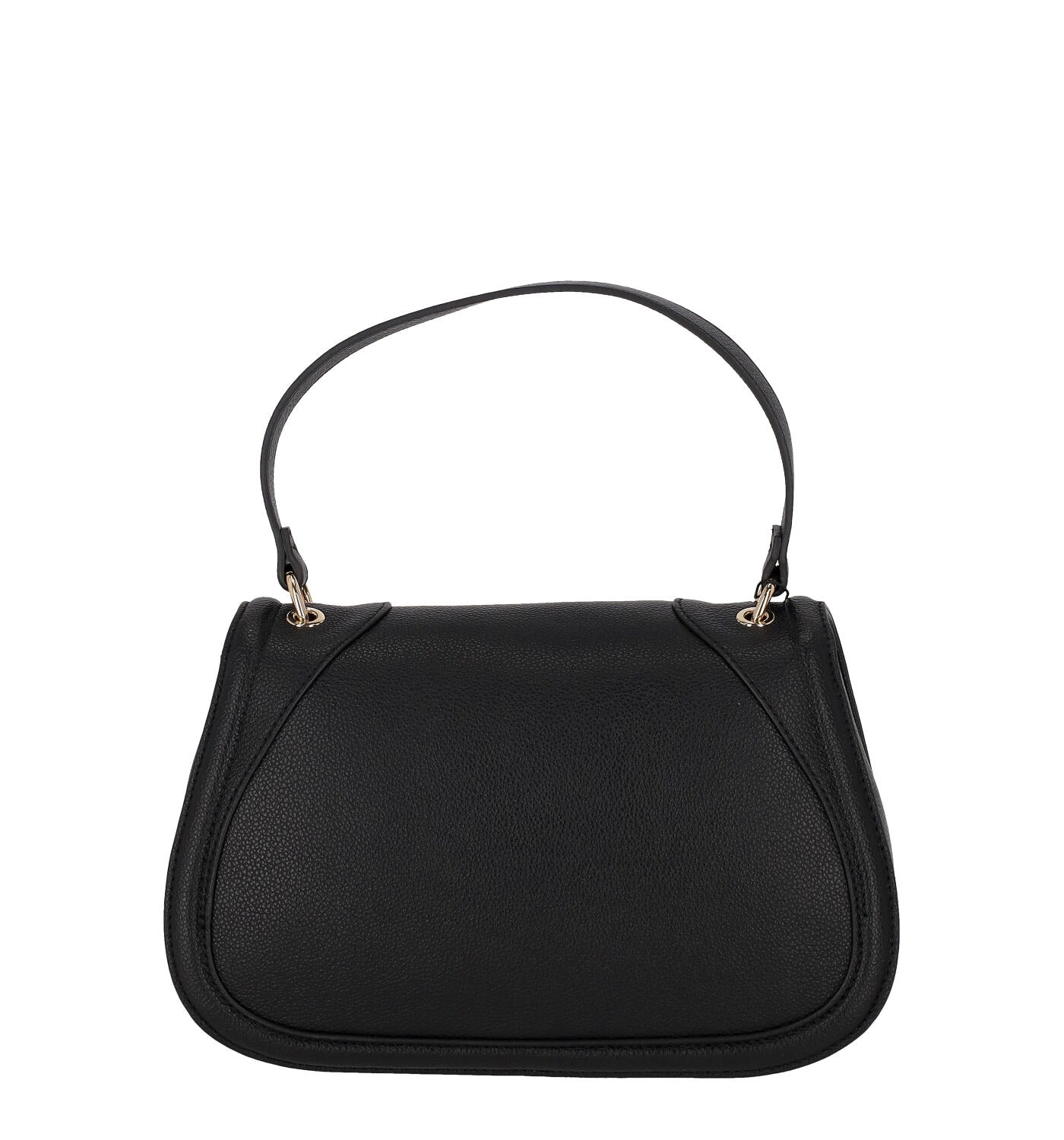 Borsa a tracolla ovale con patta , logo grande sul davanti , chiusura con bottone magnetico , manico corto e tracolla lunga removibile e regolabile.