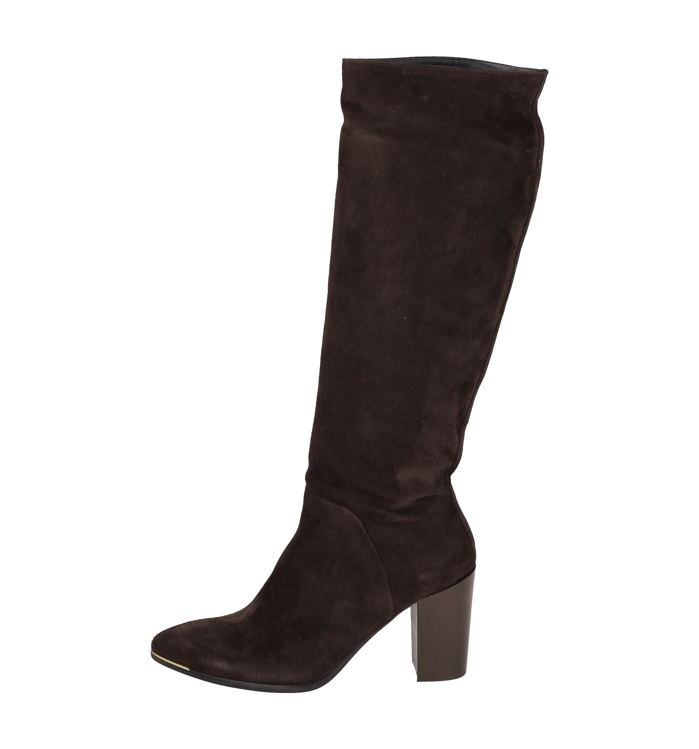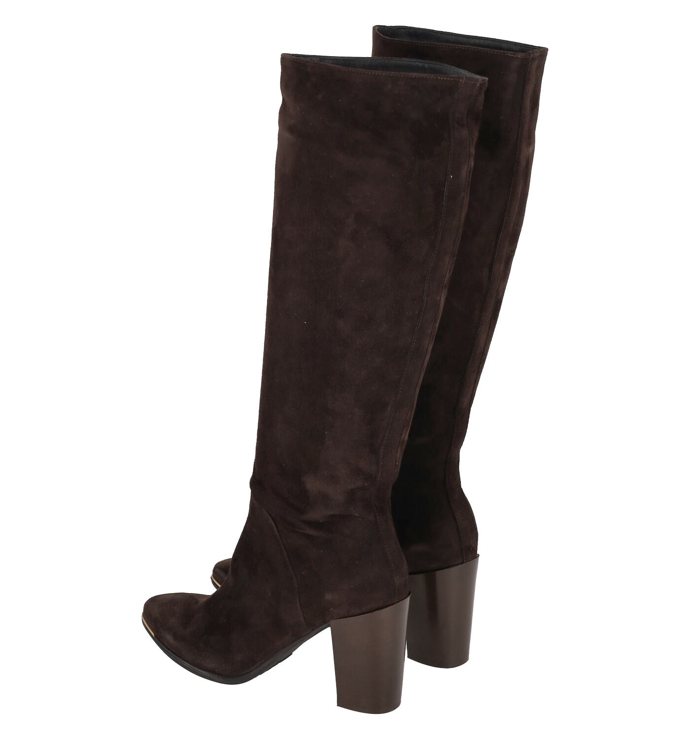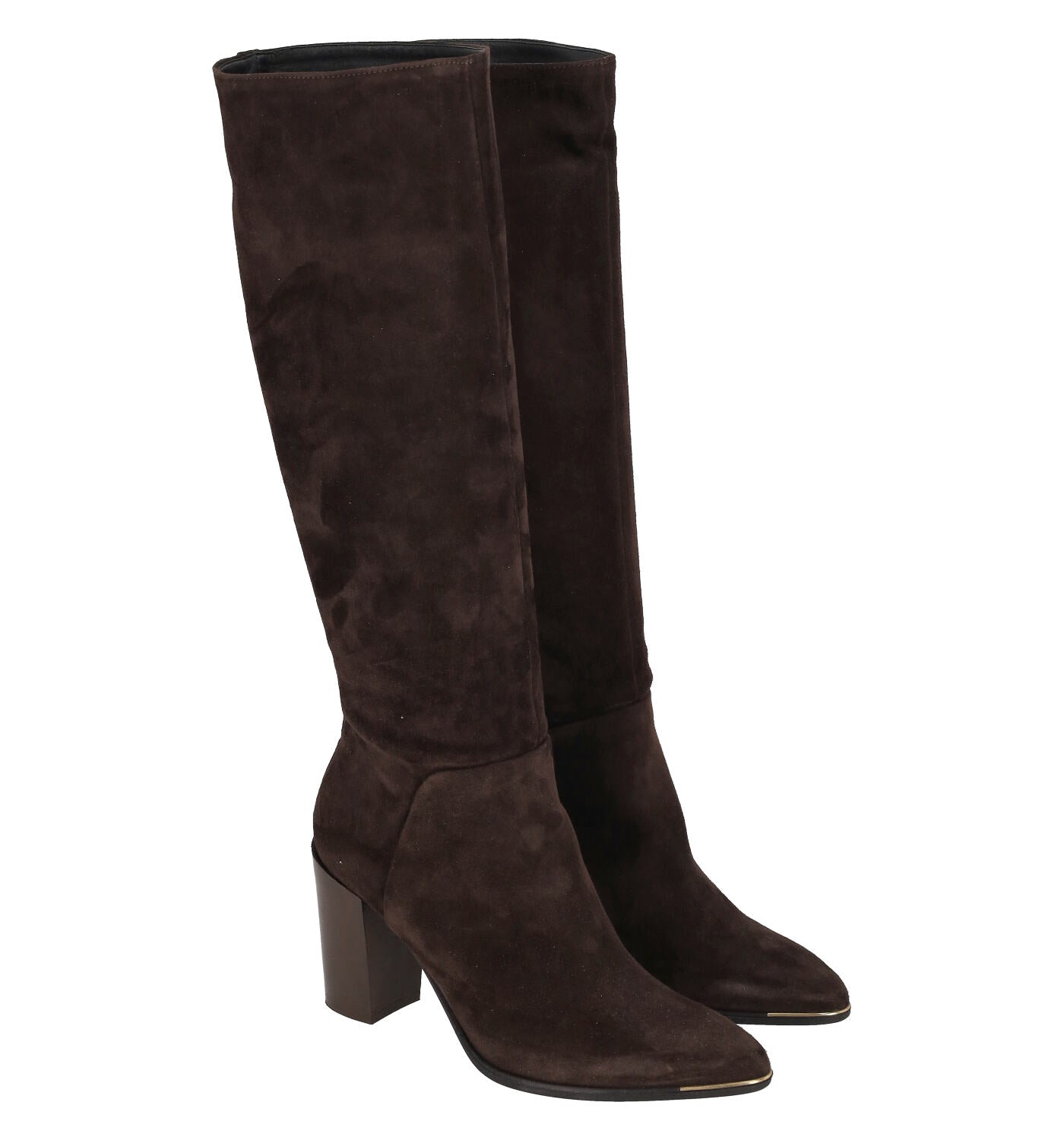 Stivale in camoscio con puntalino oro , altezza tacco 9 cm .
