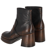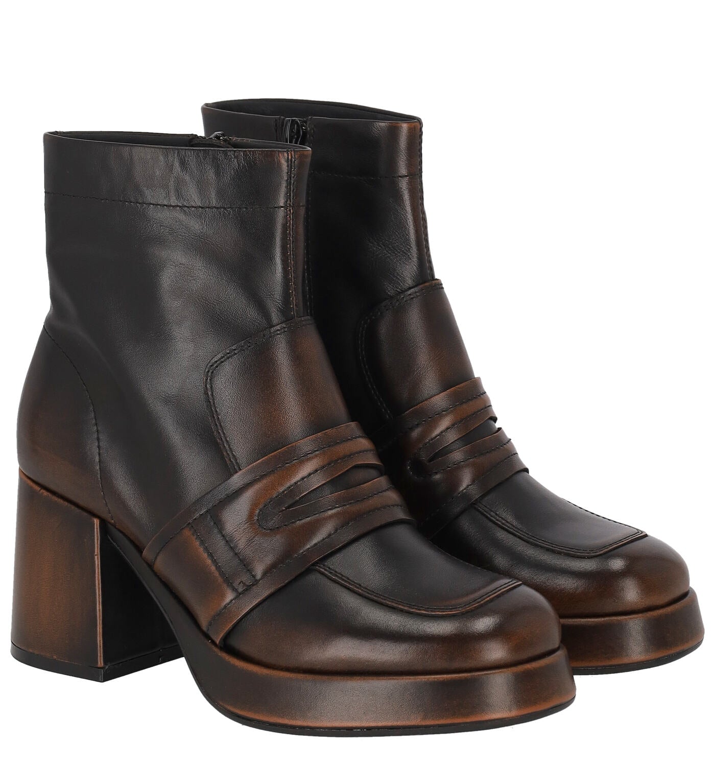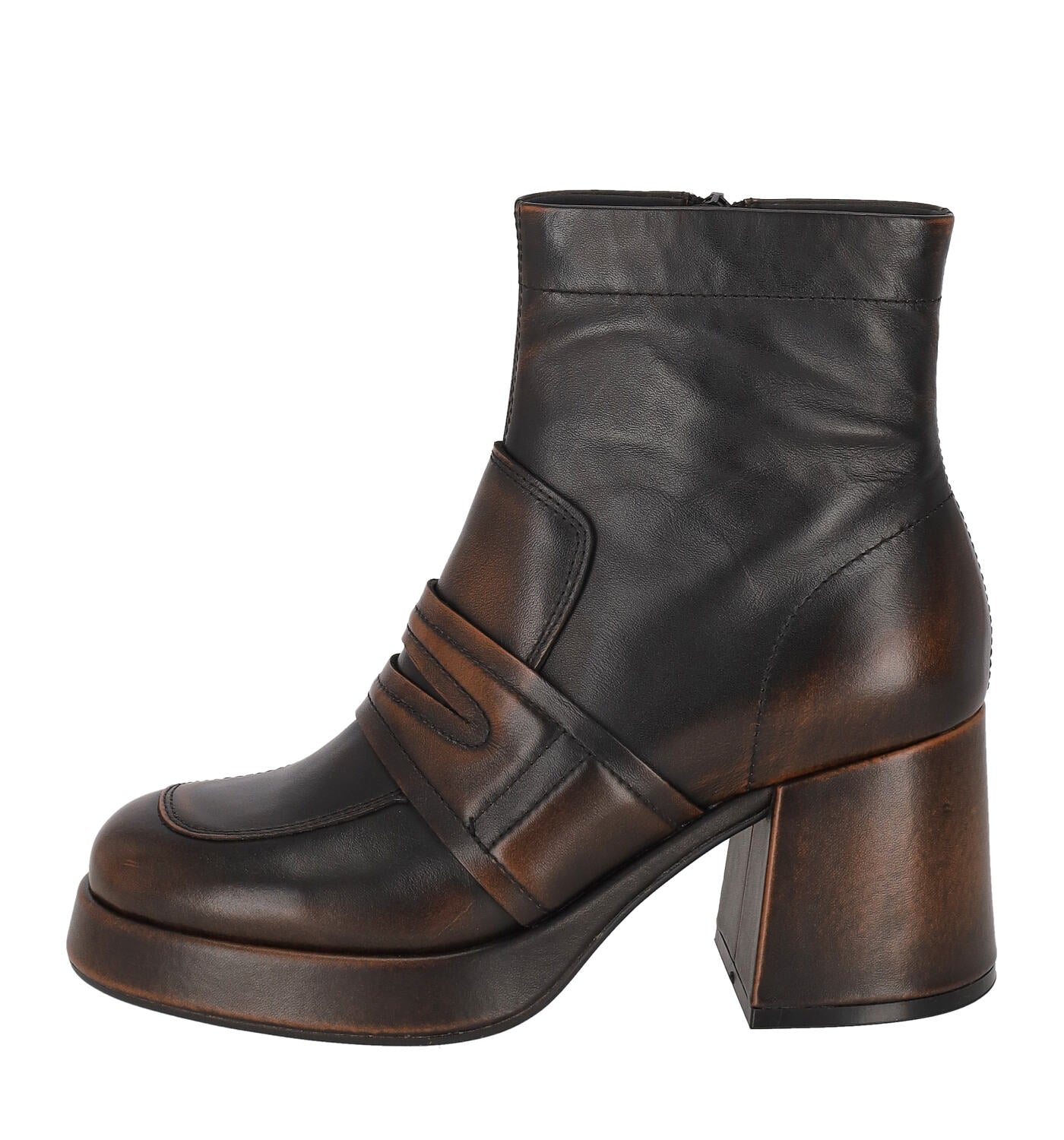 Tronchetto in pelle delavè con bendina , chiusrua con zip . Tacco largo altezza 8 cm .