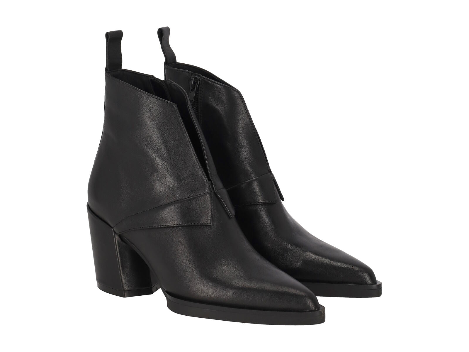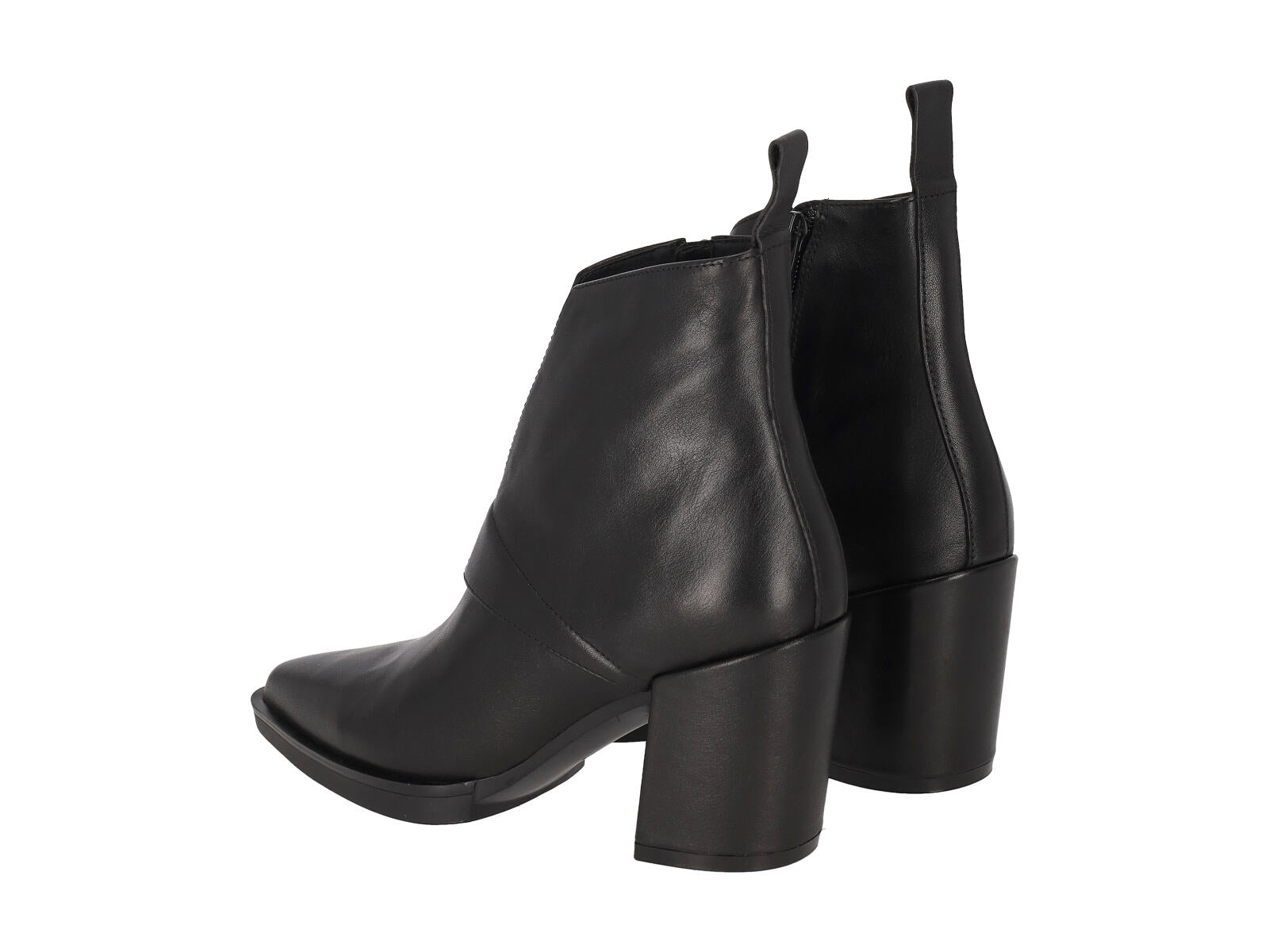 Tronchetto texano in pelle con scollo asimmetrico e zip a lato , tacco largo altezza 8 cm .