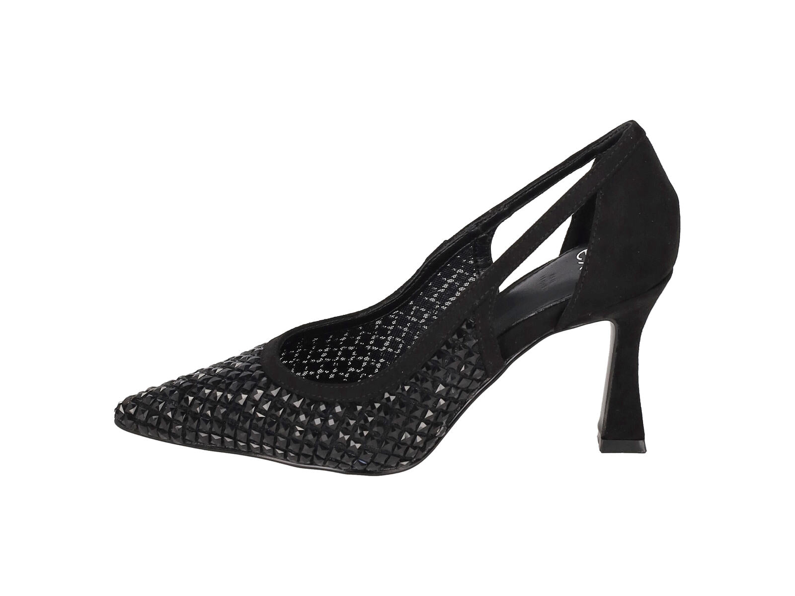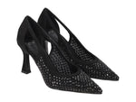 Decolleté in camoscio e rete con strass , tacco altezza 8 cm .