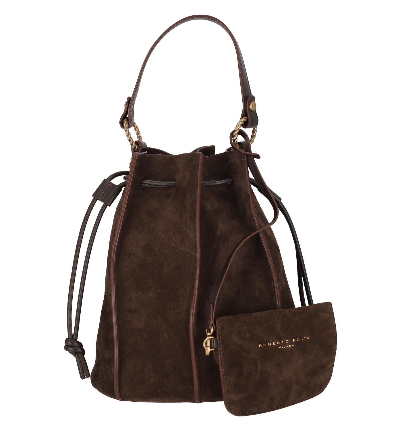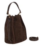 Borsa secchiello in camoscio con riporti e manico in pelle , tracolla lunga removibile.