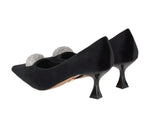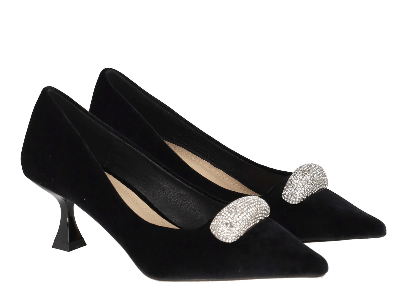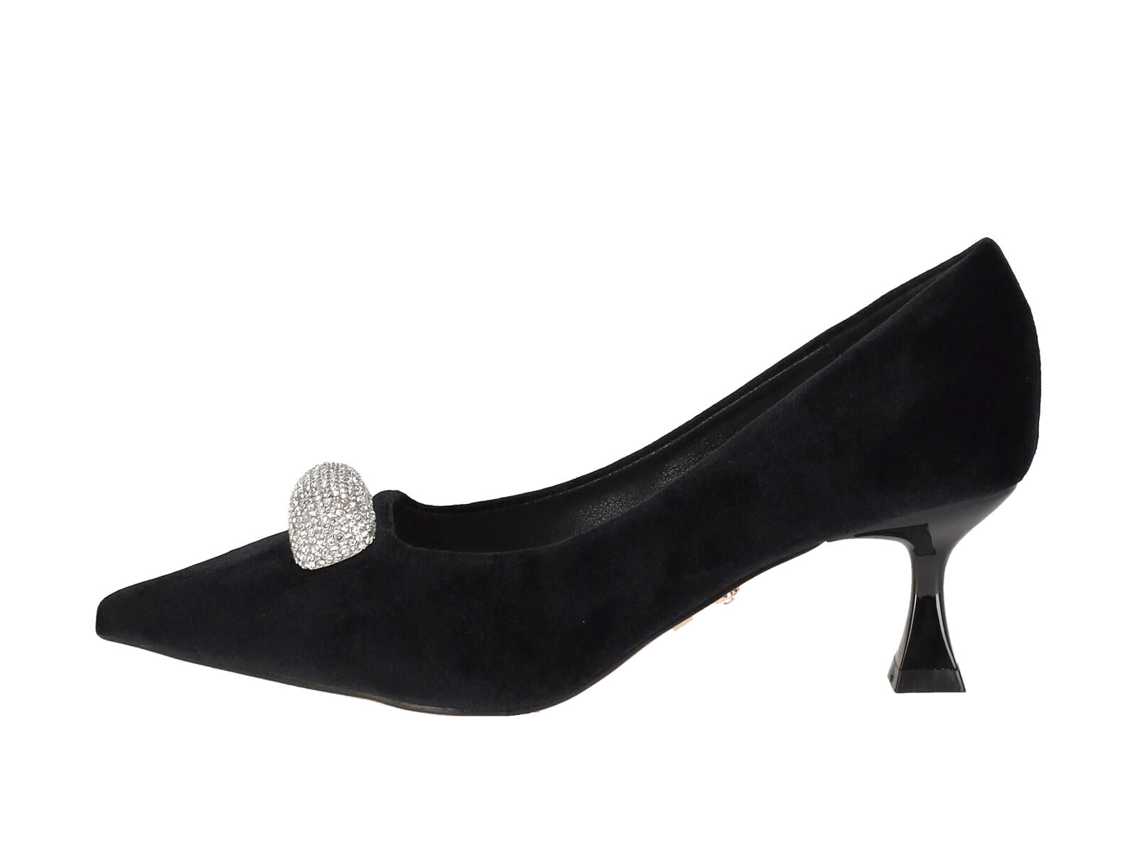 Decolletè in velluto con applicazione strass, tacco altezza 5 cm .