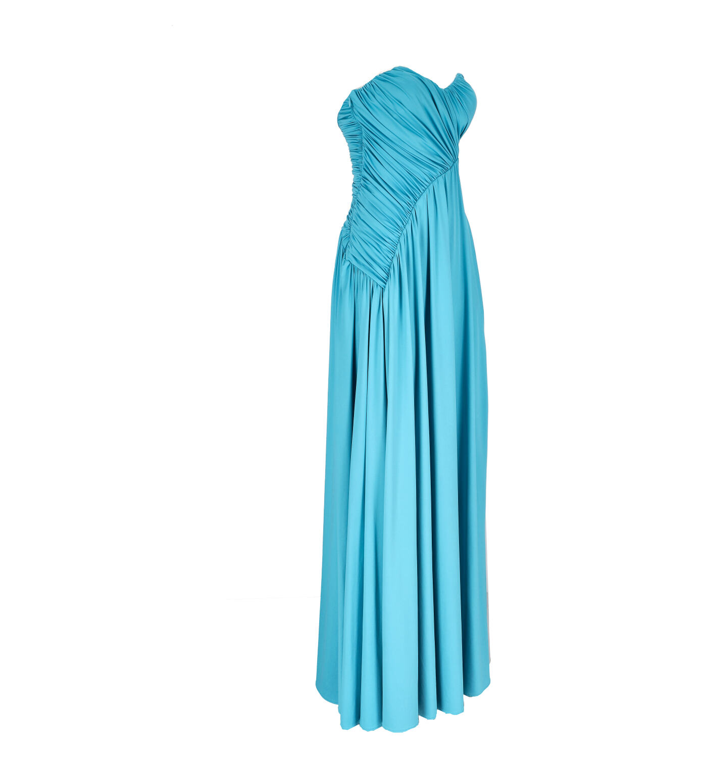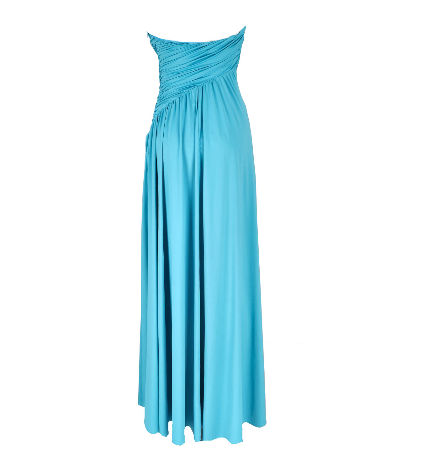 Abito lungo con corpetto aderente arricciato e spacco profondo davanti.