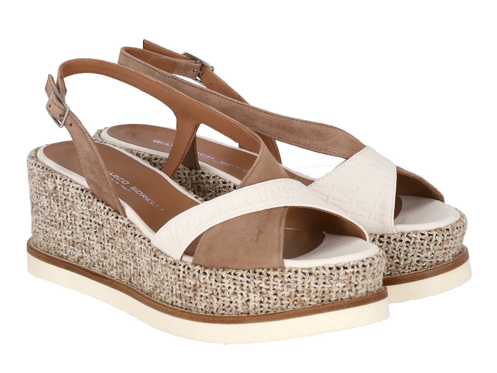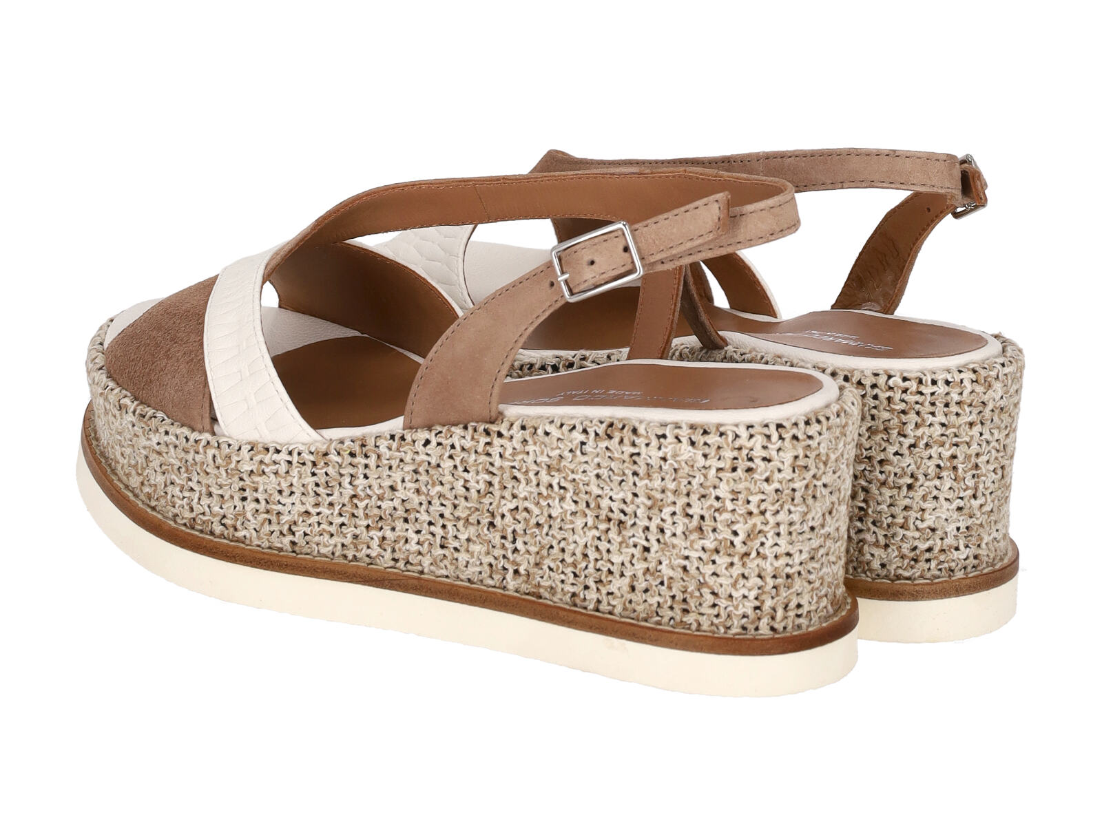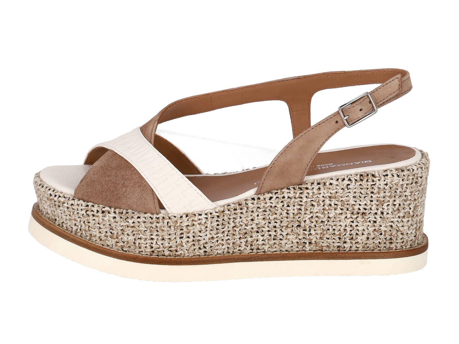 Sandalo in pelle e camoscio con zeppa , cinturino regolabile , zeppa altezza 5 cm .