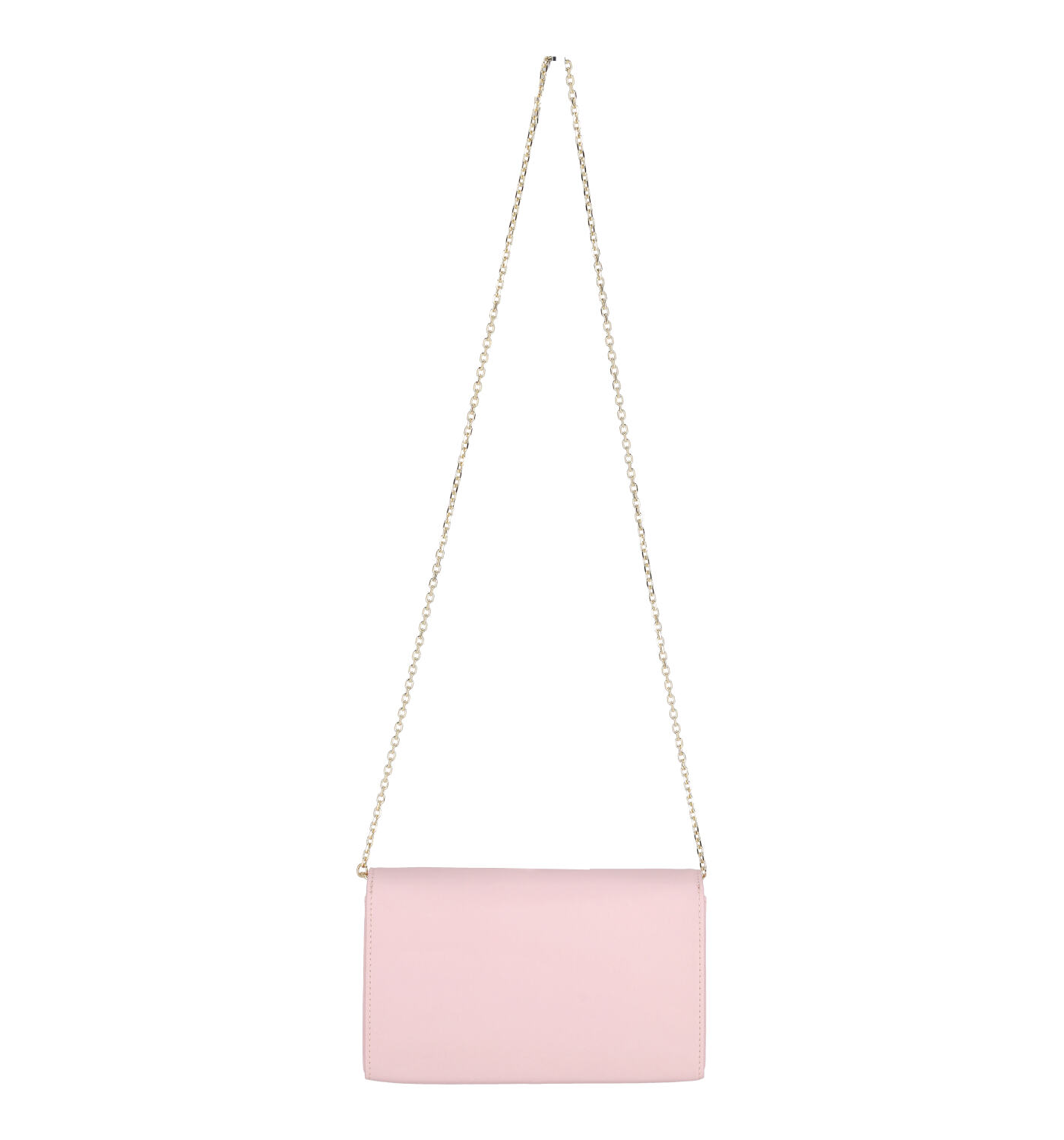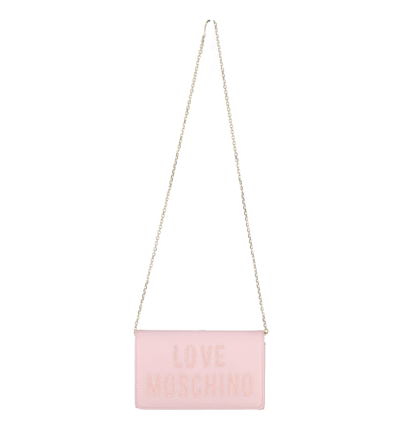 Pochette con catena lunga oro removibile ,scritta logo con pailettes.