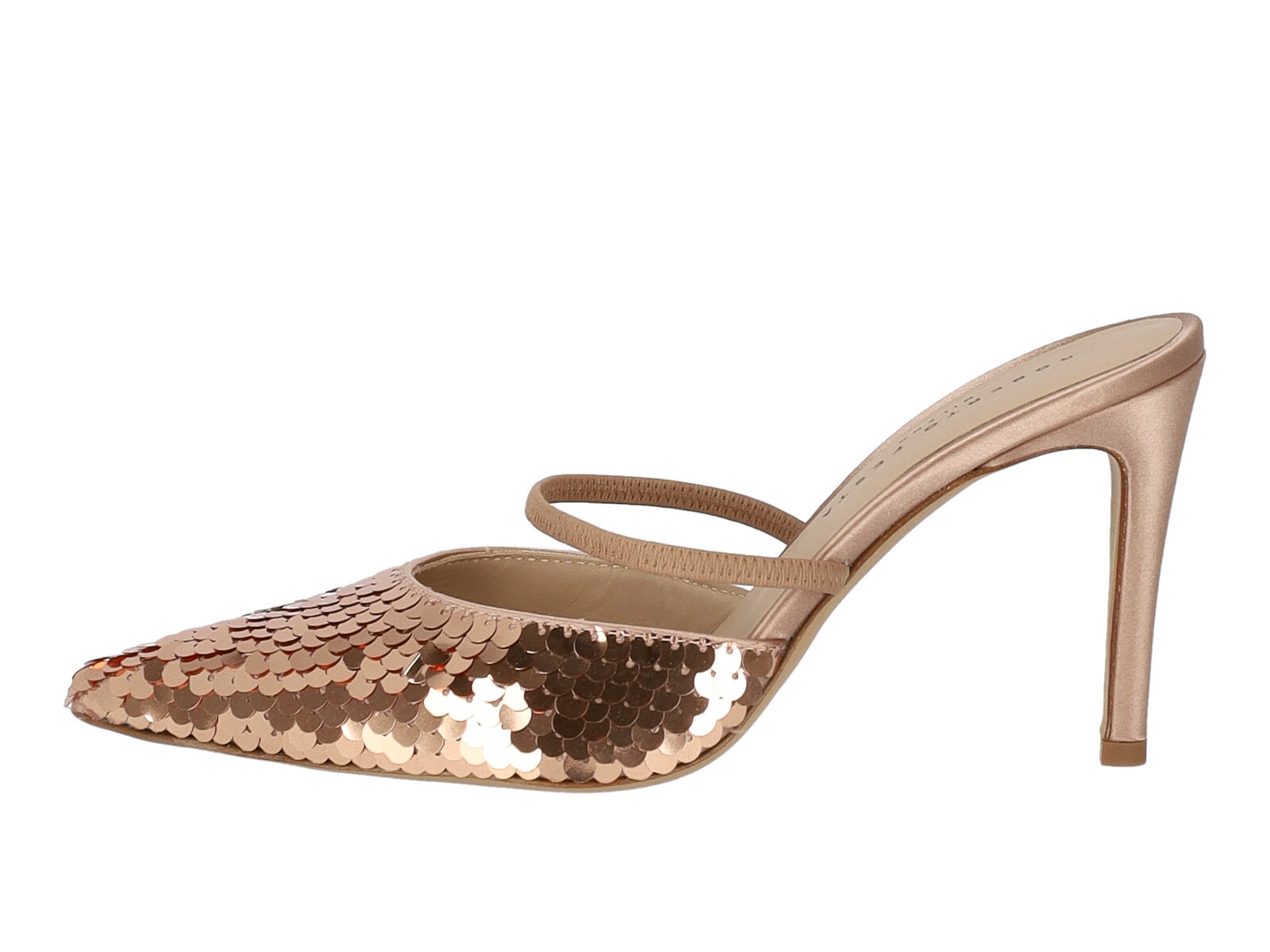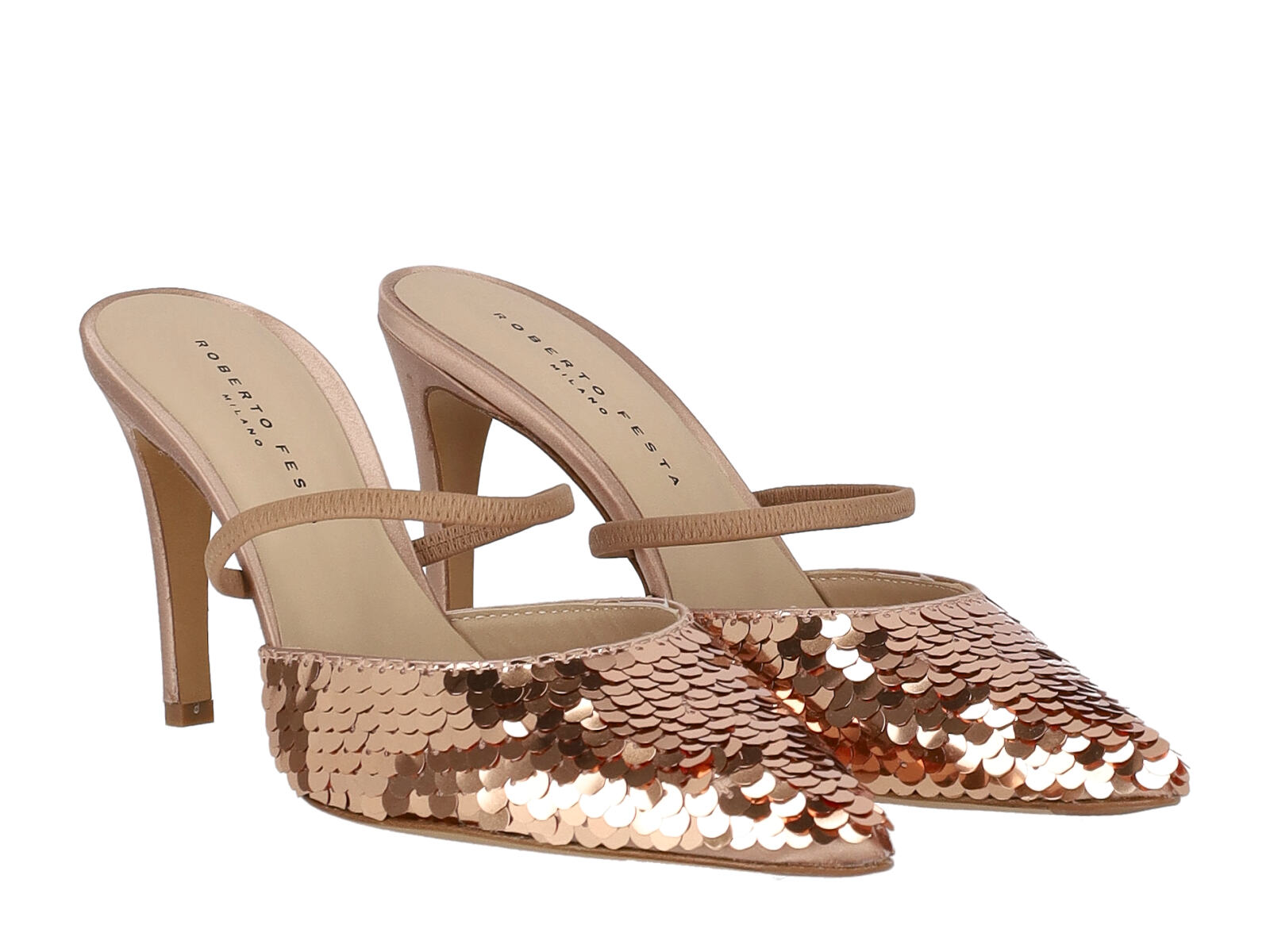 Sabot con pailettes rame, suola in cuoio. Altezza tacco 9cm.